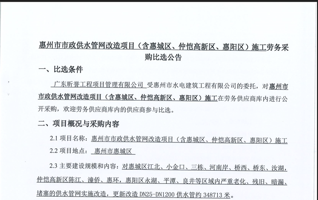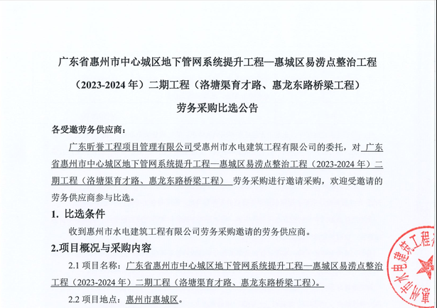 惠州市增江龍門段治理工程施工(一標(biāo)段)勞務(wù)采購中選候選人公示……